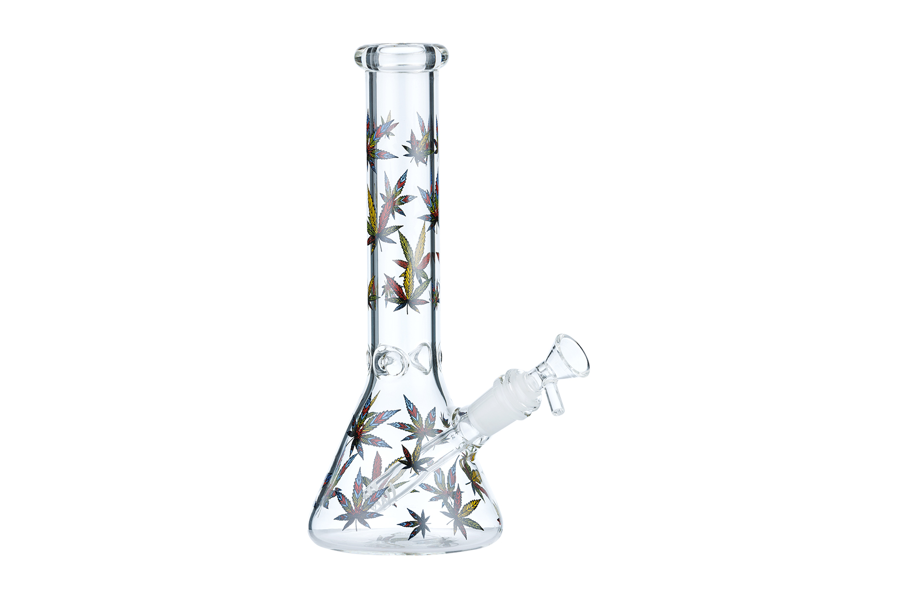 Glasbong Ice konisch transparent Hanfblatt bunt Höhe 25cm, Ø 5cm Chillum 18,8er Schliff