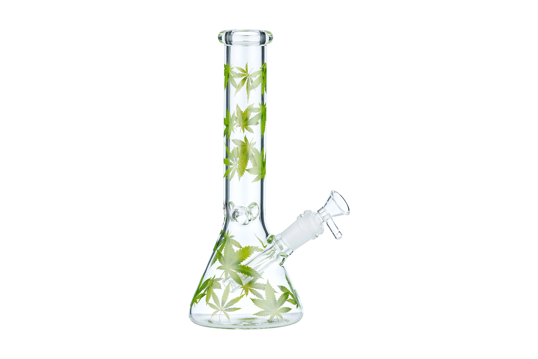 Glasbong Ice konisch transparent Hanfblatt grün Höhe 25cm Ø 5cm Chillum 18,8er Schliff