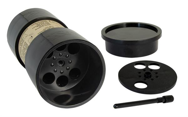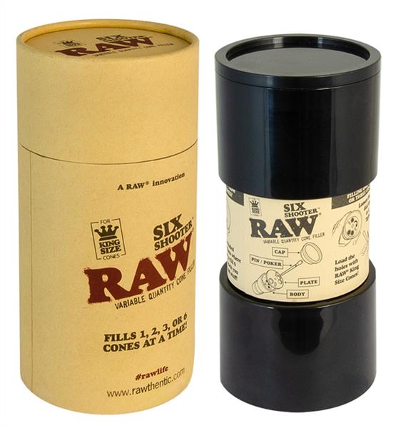 Anleitung: Deckel abnehmen, Stift lösen und Platte passend drehen, um 1, 2 oder 3 Cones zu befüllen. Für 6 Cones obere Platte komplett abnehmen. RAW King Size Cones in die Löcher stecken, Kräuter einfüllen, Deckel schließen und klopfen. Danach den Deckel unten anbringen und Cones zur Entnahme hochdrücken.